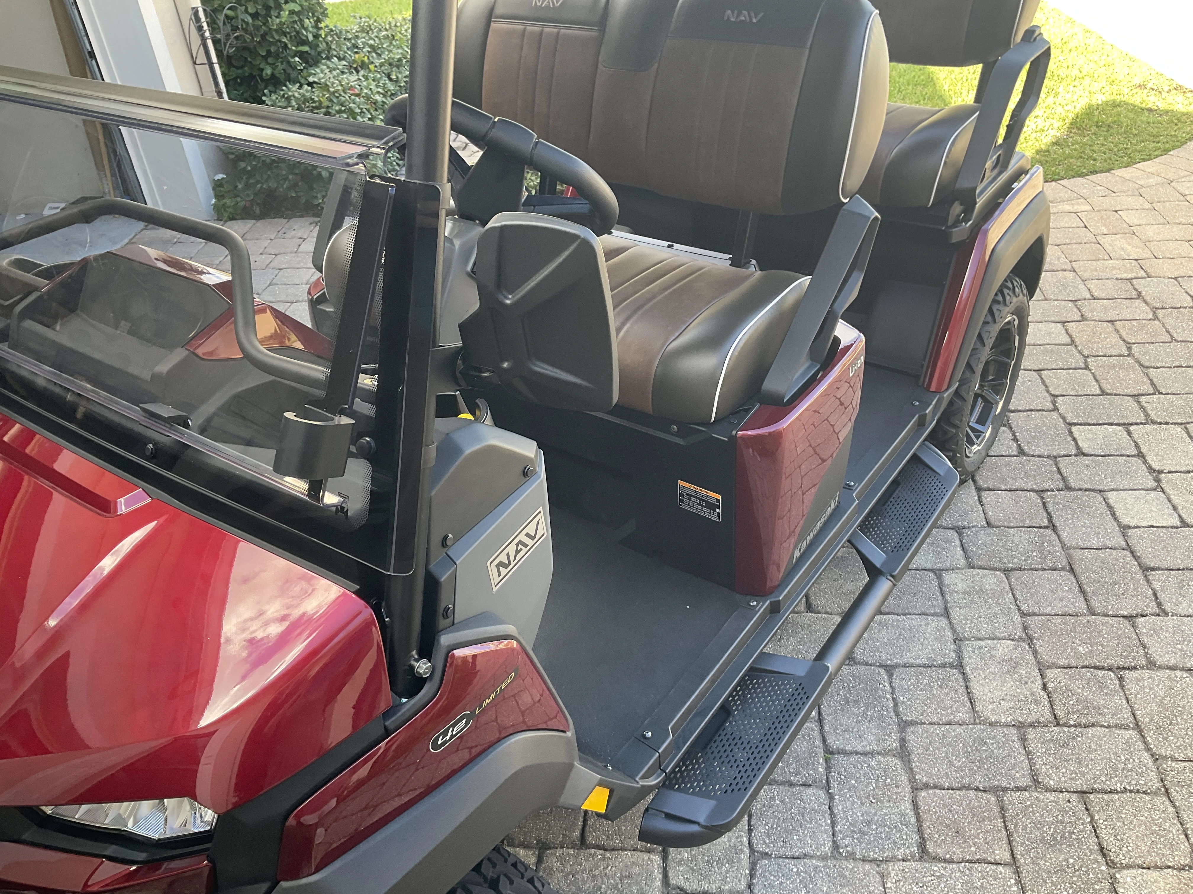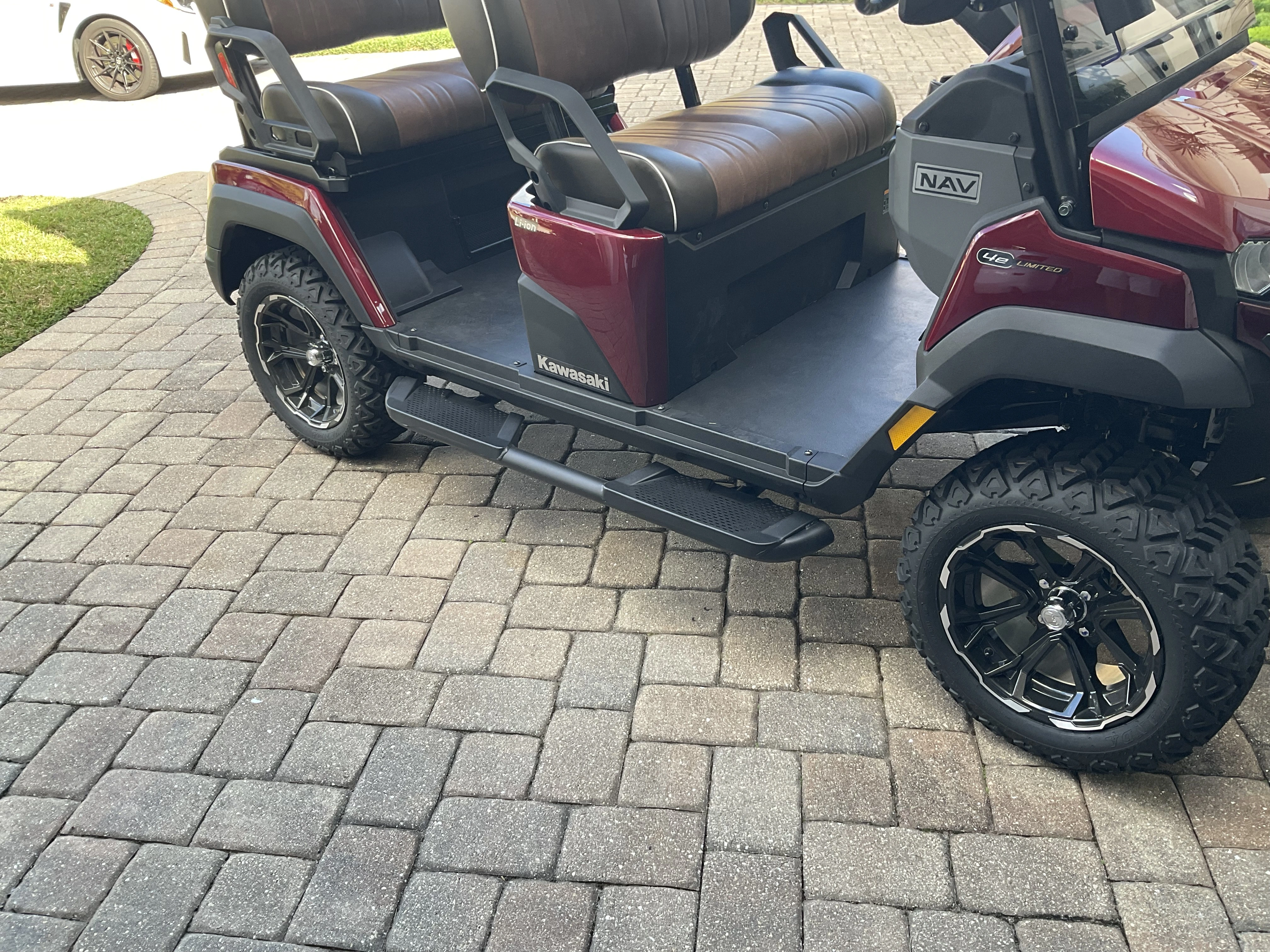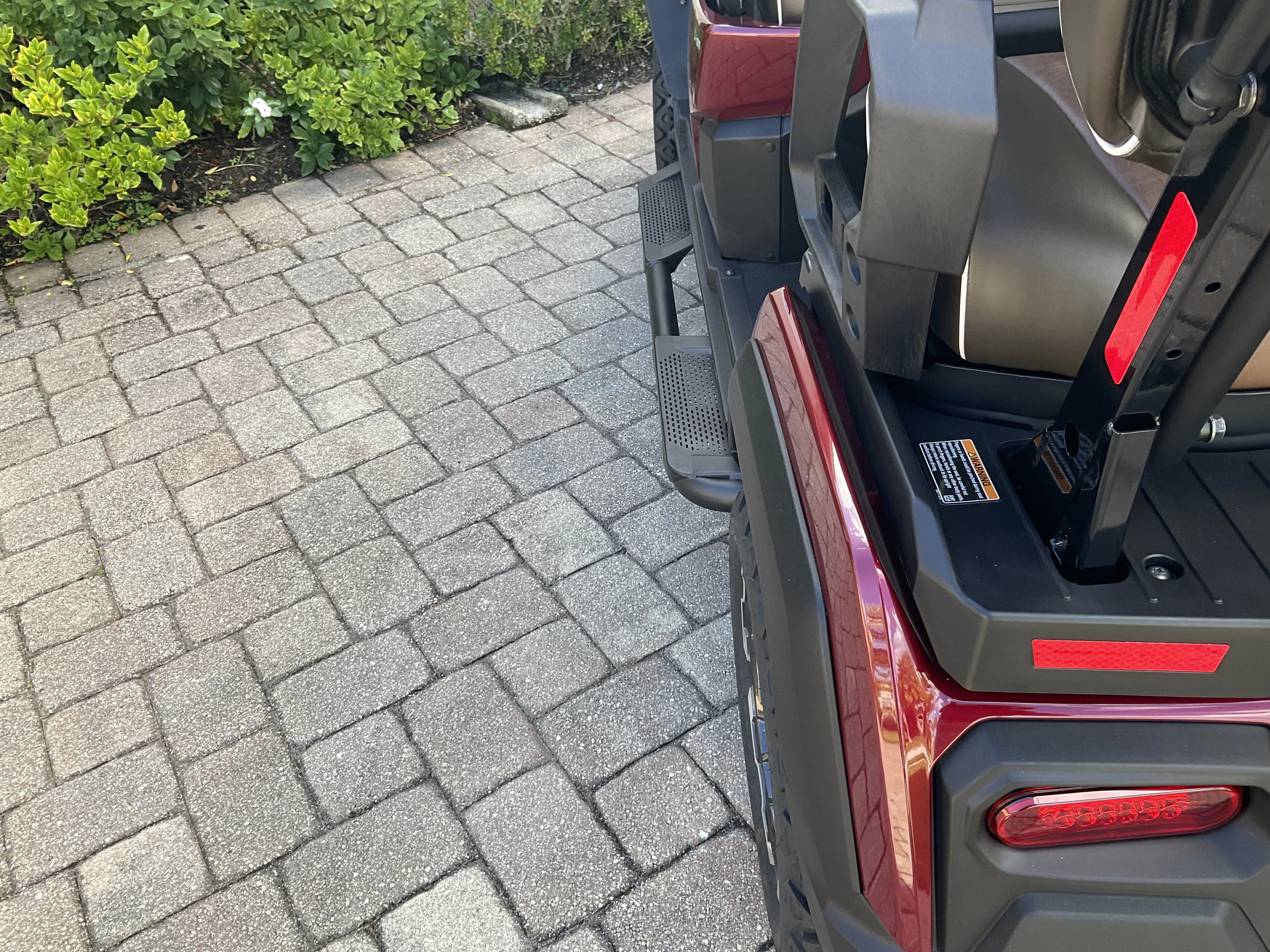 I added the running boards to the side. I believe they’re around $292, and I really like them. When we first test drove the not a golf cart golf cart and tried the backseat, it seemed a little difficult to get in and out as far as your feet. They do stick out a little wider than the car itself about 3 to 4 inches beyond the wheel edge. They are made super solid and could not be easier to install. I happened to have a torque wrench so I could tighten the bolts as the instructions directed.